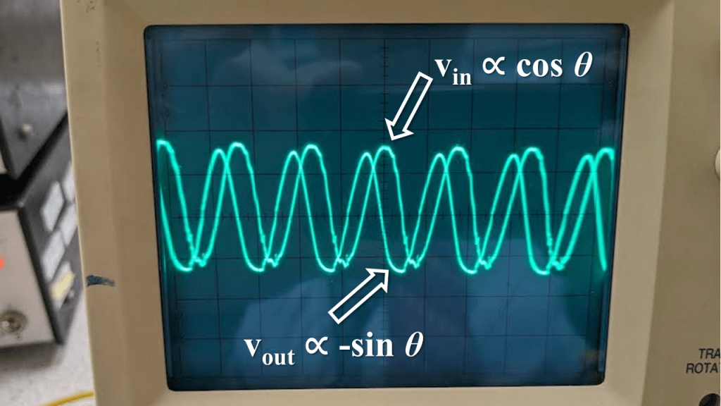 I connected the differentiator circuit to a sinusoidal input potential, and after some fiddling with the y-gain I was able to see the output potential. As you can see, the circuit is differentiating correctly!