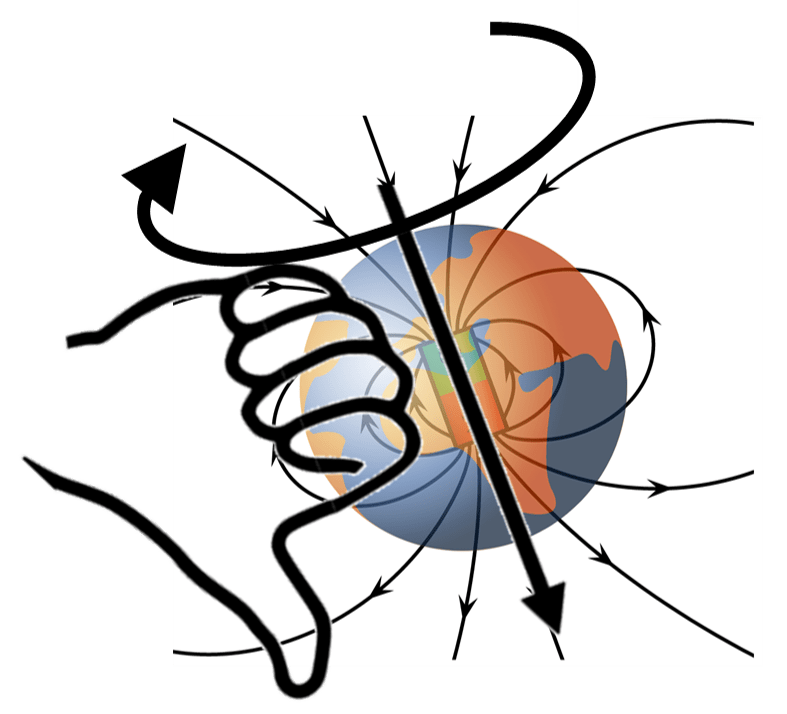 This is where the link between electric currents and magnetic fields becomes important in inventing a naming convention. Consider the following analogy. From the surface of the Earth, there is a north pole and a south pole, and the sun rises in the east and sets in the west as it moves around the earth. I know this sounds a bit geocentric, a bit Ptolemaic, but it’s an analogy used to come up with a naming convention, which we still use today, so go with it. From the middle of a coil of current carrying wire, there is a north pole and a south pole, and current flows around the coil in a particular direction.