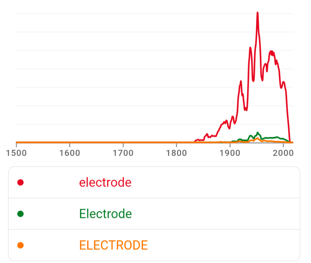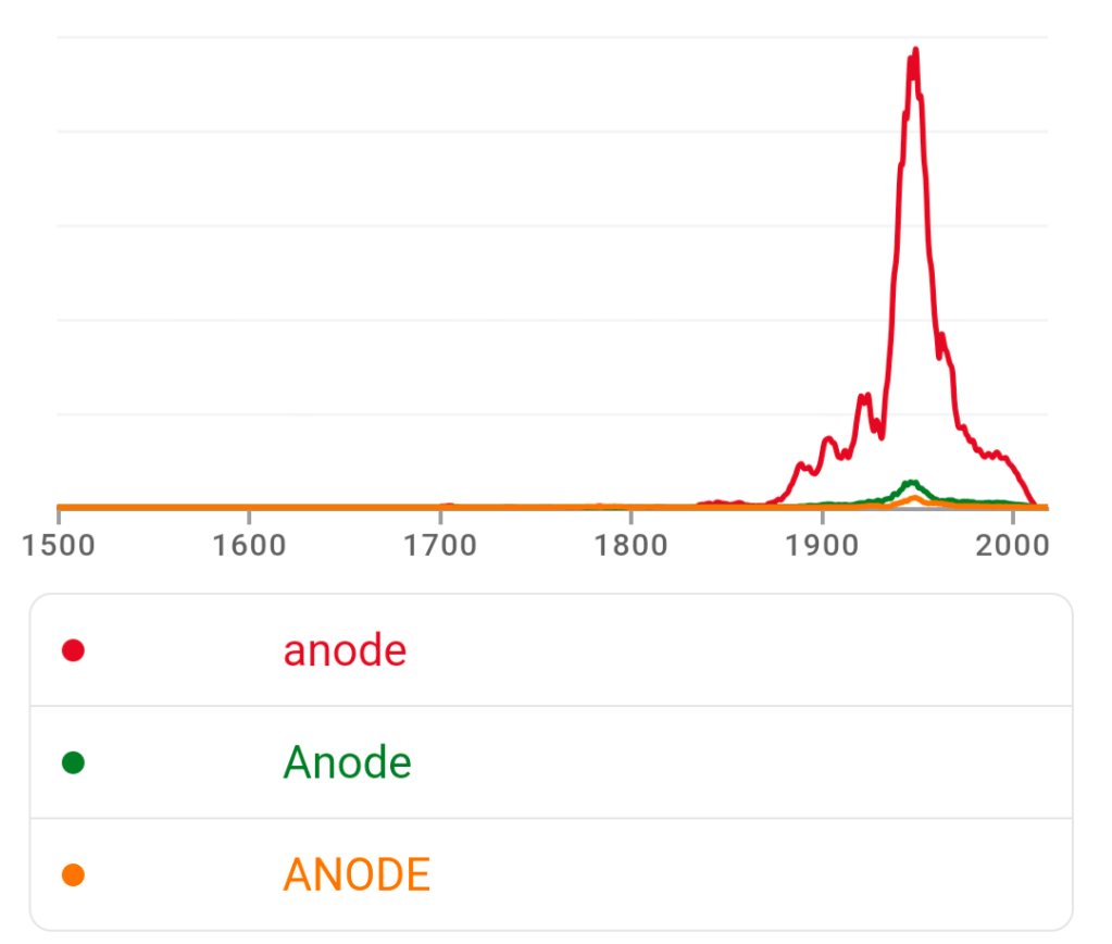 However, as it stands the north-south naming convention is problematic because the magnetic poles’ names are the opposite to the geographic poles’ names, so if a convention was chosen where the east and west were not reversed – or even if a convention was chosen where they were reversed – it could cause confusion. To avoid this, the word up was chosen instead of east, and the word down was chosen instead of the word west. The sun goes up in the east and down in the west, so we now have an up pole and a down pole for electric currency. The Greek word for up was ana, and down was kata. Rather than referring to the ends of the wire connected to the voltaic pile as poles, a term that was to be reserved for magnetic fields, the greek word for road/route/way was chosen, hodos. So the east pole became the up way, or the ana hodos (which became anode), and the west pole became the down way, or the kata hodos (which became cathode). The general term for one of these electrical routes in a solution became electrode (electricity way).