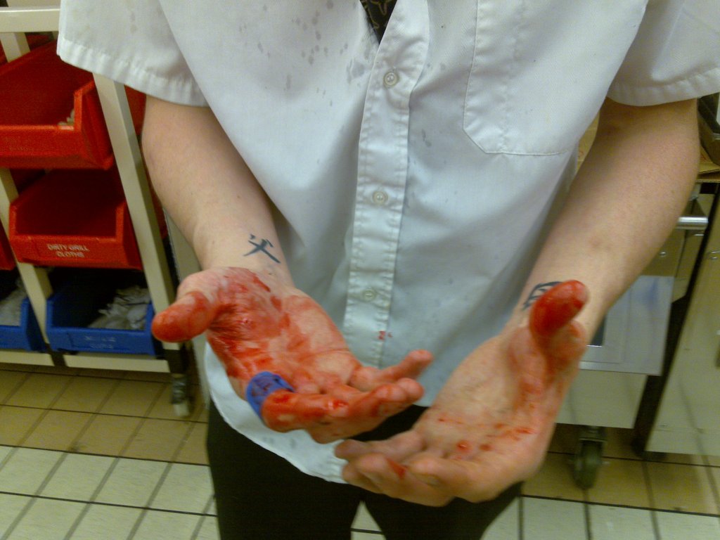 The working environment was dangerous. The bottom platen of the grill was held at 177°C, and the top plate at 218°C. Meat was placed between these two platens to cook, and a hydraulic system would push the platens together so the meat would cook from both sides. When the top platen rose after the allotted time, it would be dripping with hot meat fat. The cook would have to put their hands into that space to remove the meat, with the hot fat dripping on their hands and arms. Then they would clean down the platens and repeat. My arms and hands are still scarred from the experience, and I haven’t worked there since 2010 (I had to go back and work there between my PhD and my PGCE). On one occasion, near the beginning of the shift, I slipped and fell. I stopped myself by putting my left hand on the grill surface (remember 177°C and covered in hot fat) and had to push against the grill surface to get back to my feet. I was holding a tray of burgers in my right hand and didn’t want to stop them. As it was near the beginning of my shift and I was the shift manager, I couldn’t leave. I tried to ring other managers for help and they did not pick up the phone. So, I taped a napkin to my burned hand and just got on with it, one handed. The next day I went to the hospital to get it properly dressed.