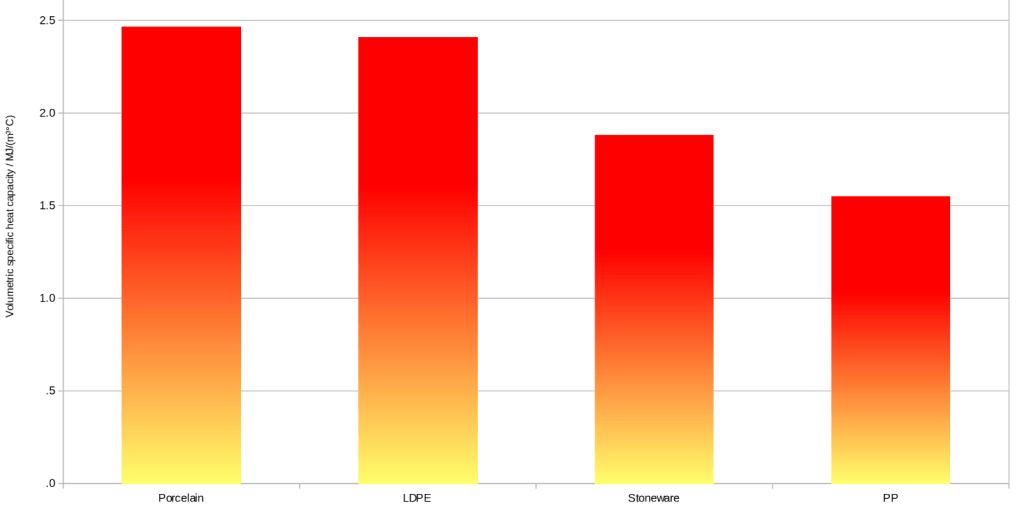 That explains why the porcelain items can be taken out of the dishwasher dry, by PP items are still wet. What about LDPE versus stoneware? Here, the volumetric specific heat capacity of the stoneware is actually lower than that for LDPE, so what’s going on here?