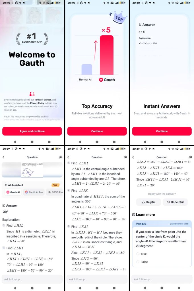 That brings me on to AI tools. The first was one that claimed to be the most accurate, claiming to be five times as accurate as ‘normal AI‘ (whatever that means). It’s called Gauth and truthfully I’d never heard of it before last night. It claims to be the #1 education app and give instant answers. As you can see from the screenshots below, it did give an answer in very little time, but the answer was wrong. The correct answer is 50°, the app gave 20°. Oh dear.