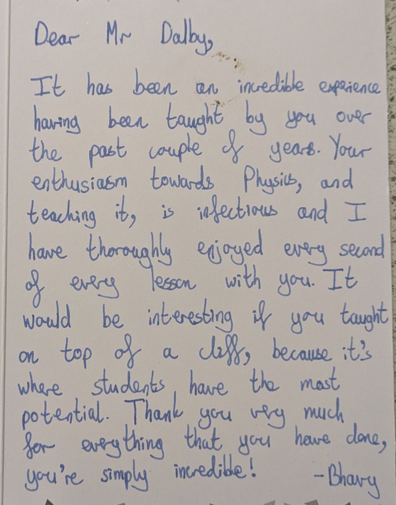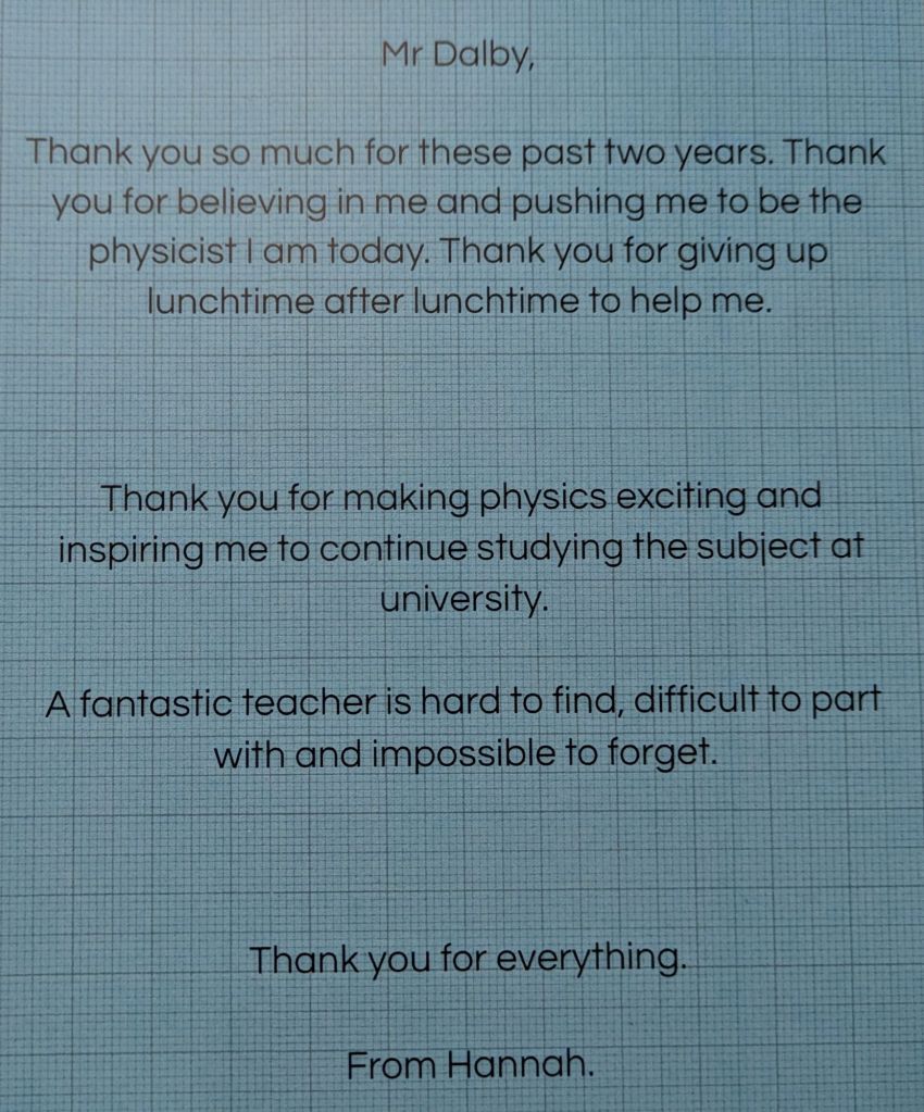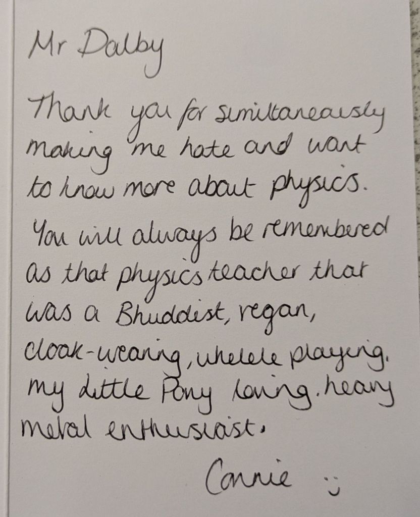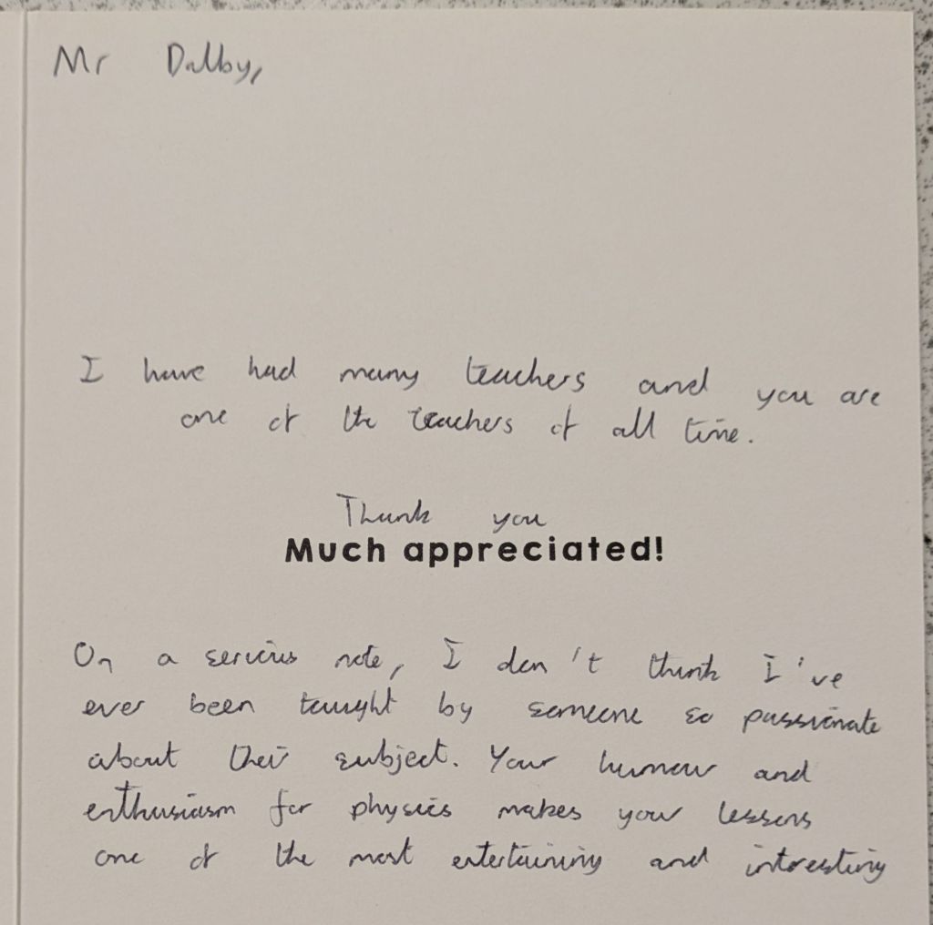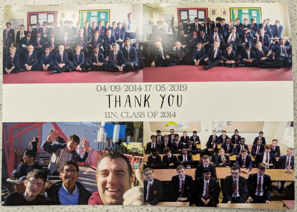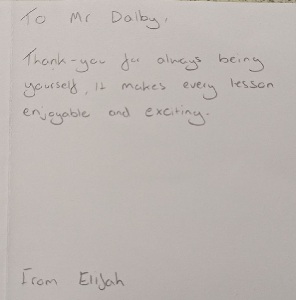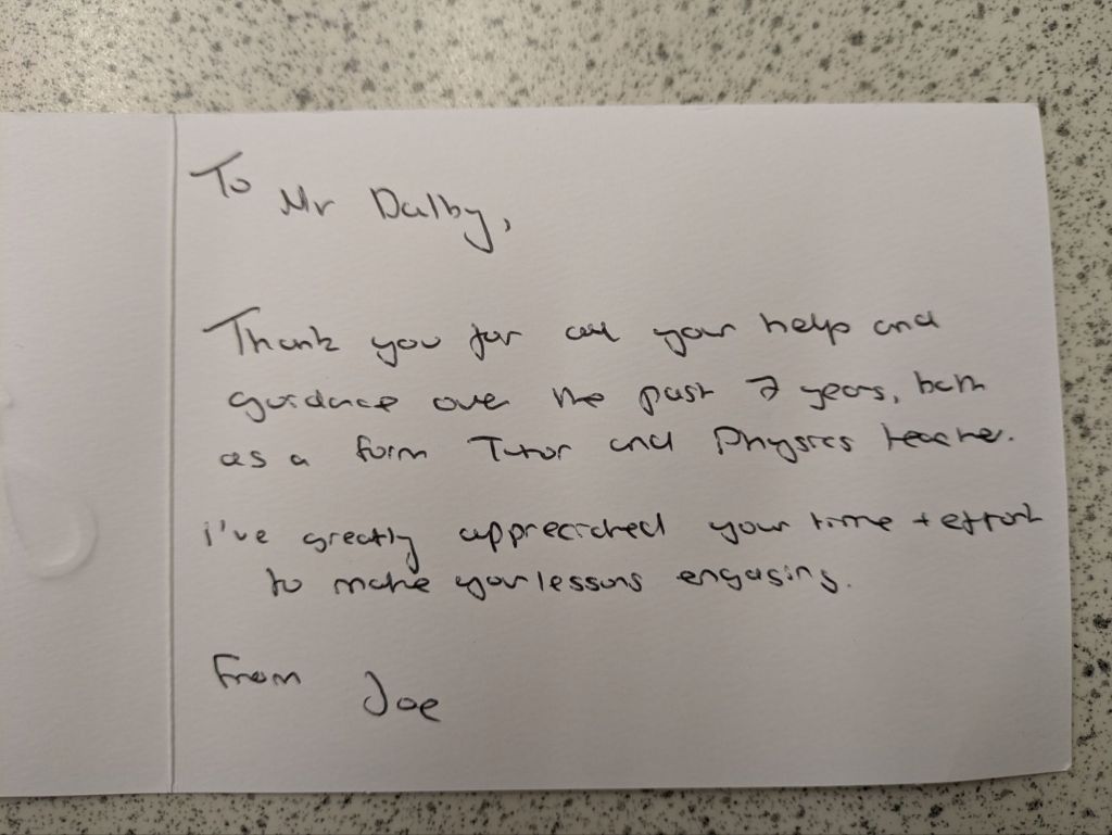 And then they leave, and a new batch arrives, and the cycle repeats again. Many students wish to give their teachers gifts to show their appreciation, especially in the Summer when they are leaving to go to college or university. We teachers do not expect gift, but the little tokens of appreciation mean a lot. As a teetotal vegan, I cannot count how many mugs I have been bought (ironically, I very rarely drink hot drinks, so they rarely get used). To me, what means more is the little notes of appreciation. The cards and letters. I keep these, and when I’m having a bad day it is good to get them out and flick through them to remind myself that what I am doing is making a difference.