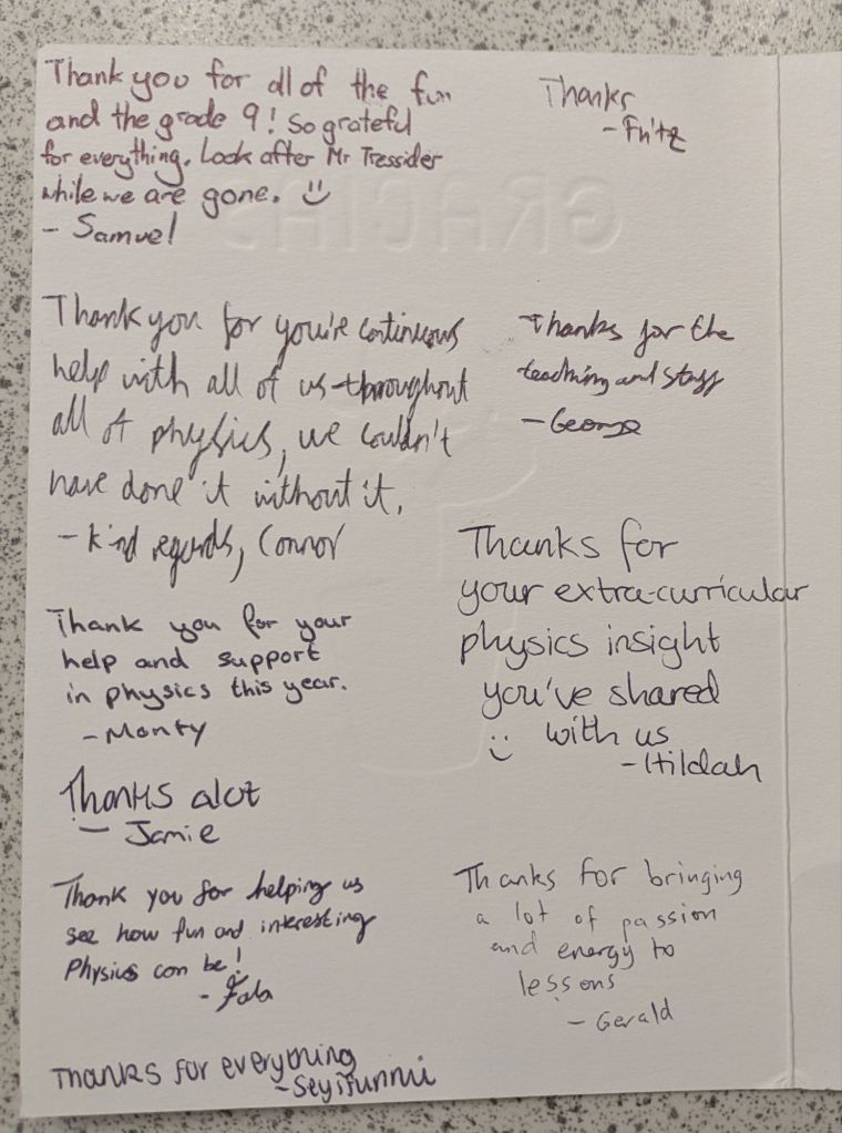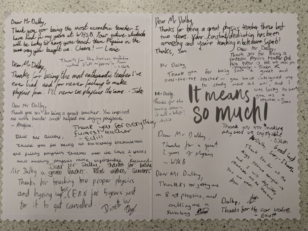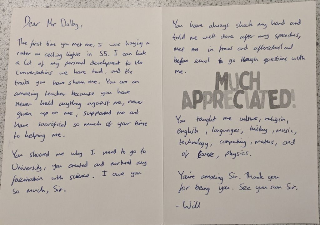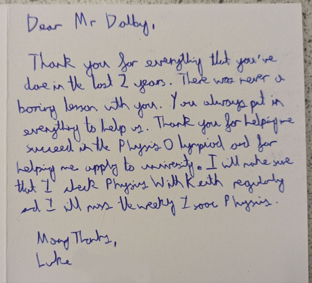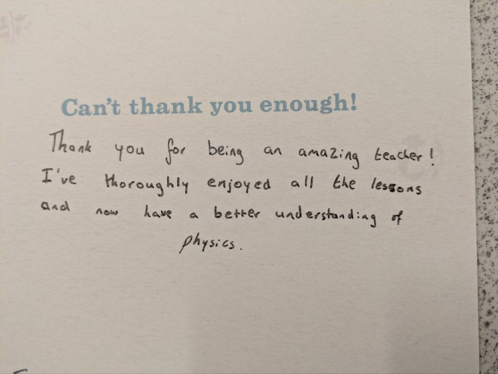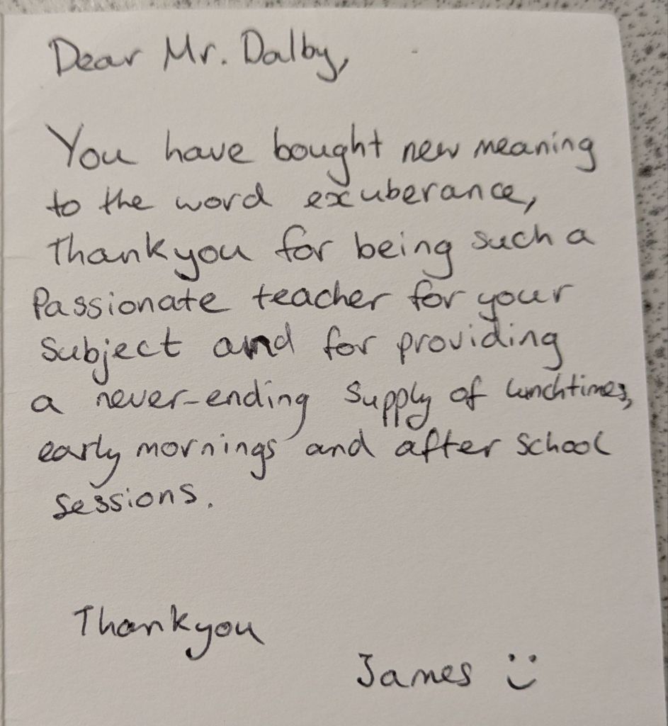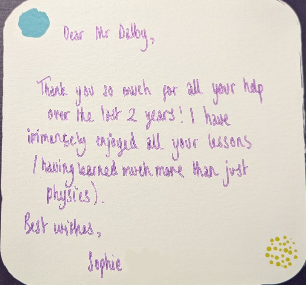 And then they leave, and a new batch arrives, and the cycle repeats again. Many students wish to give their teachers gifts to show their appreciation, especially in the Summer when they are leaving to go to college or university. We teachers do not expect gift, but the little tokens of appreciation mean a lot. As a teetotal vegan, I cannot count how many mugs I have been bought (ironically, I very rarely drink hot drinks, so they rarely get used). To me, what means more is the little notes of appreciation. The cards and letters. I keep these, and when I’m having a bad day it is good to get them out and flick through them to remind myself that what I am doing is making a difference.
