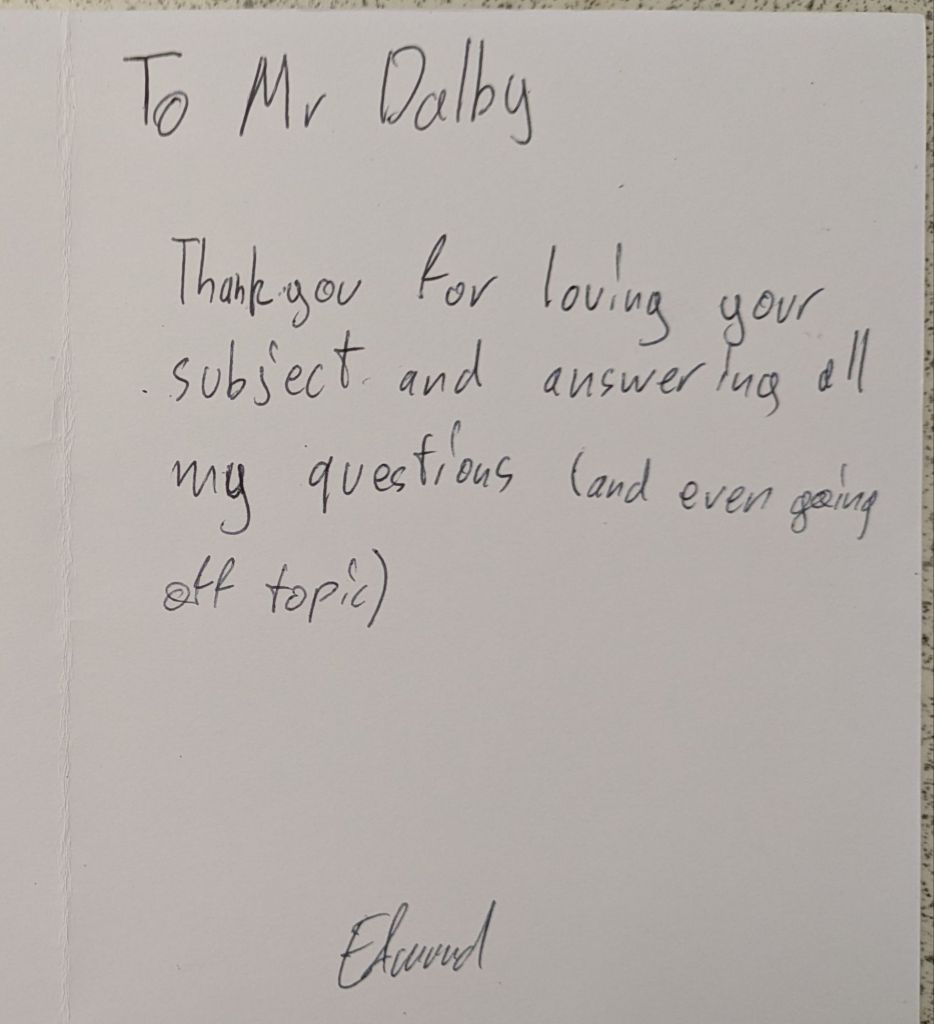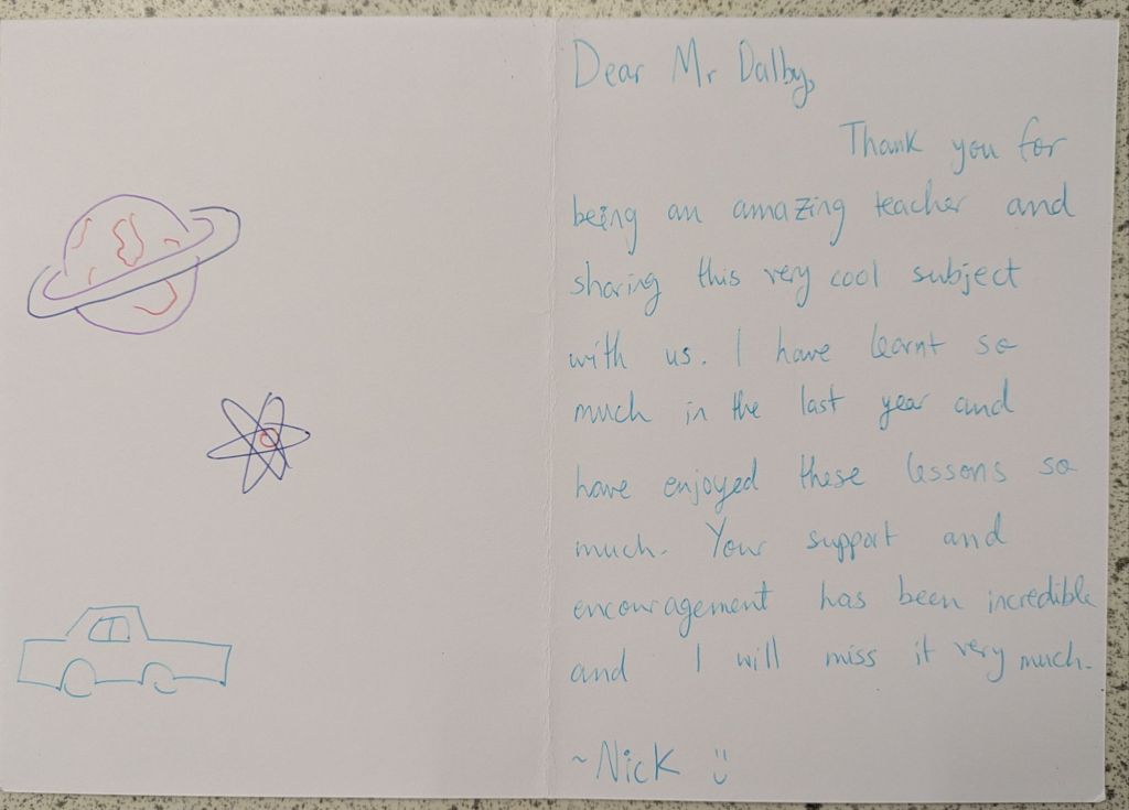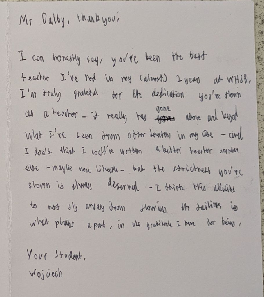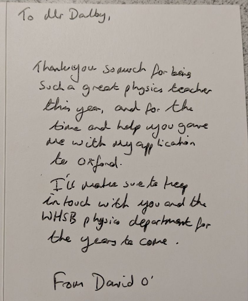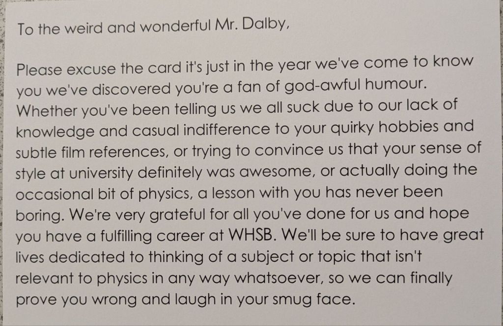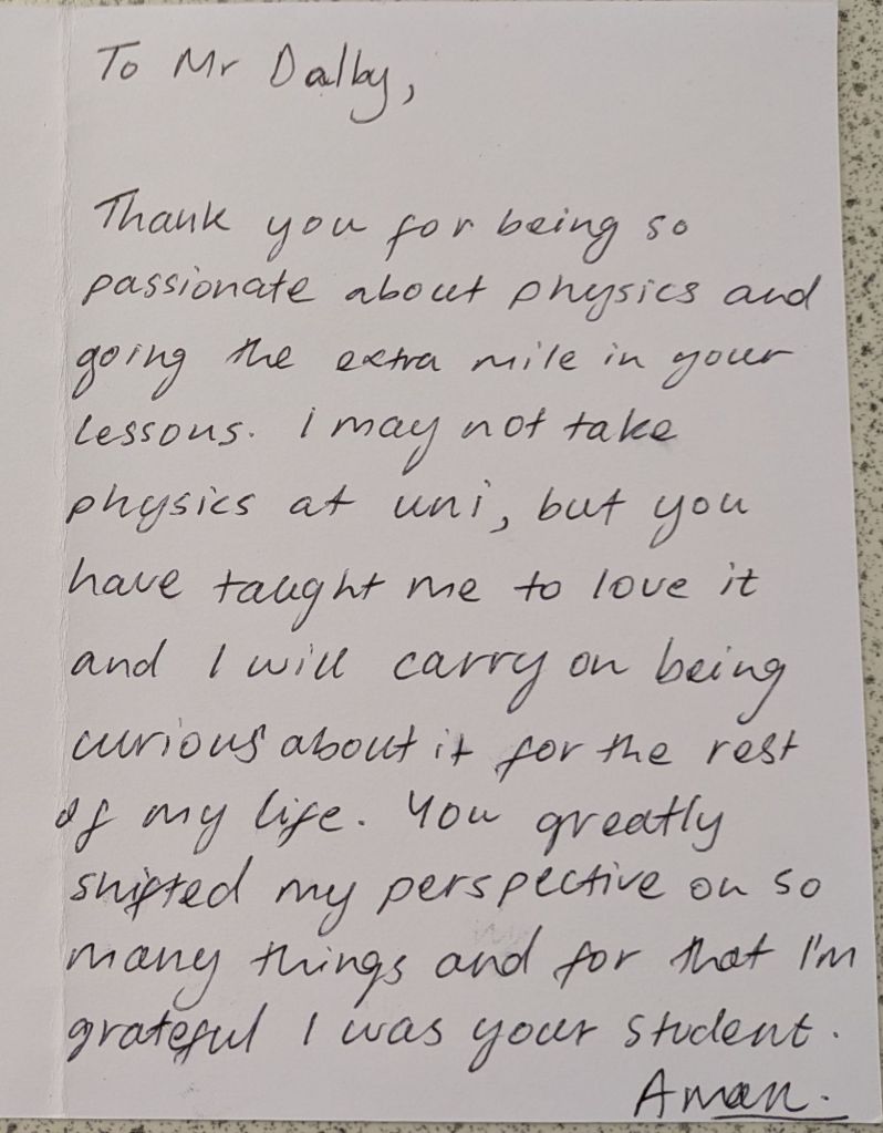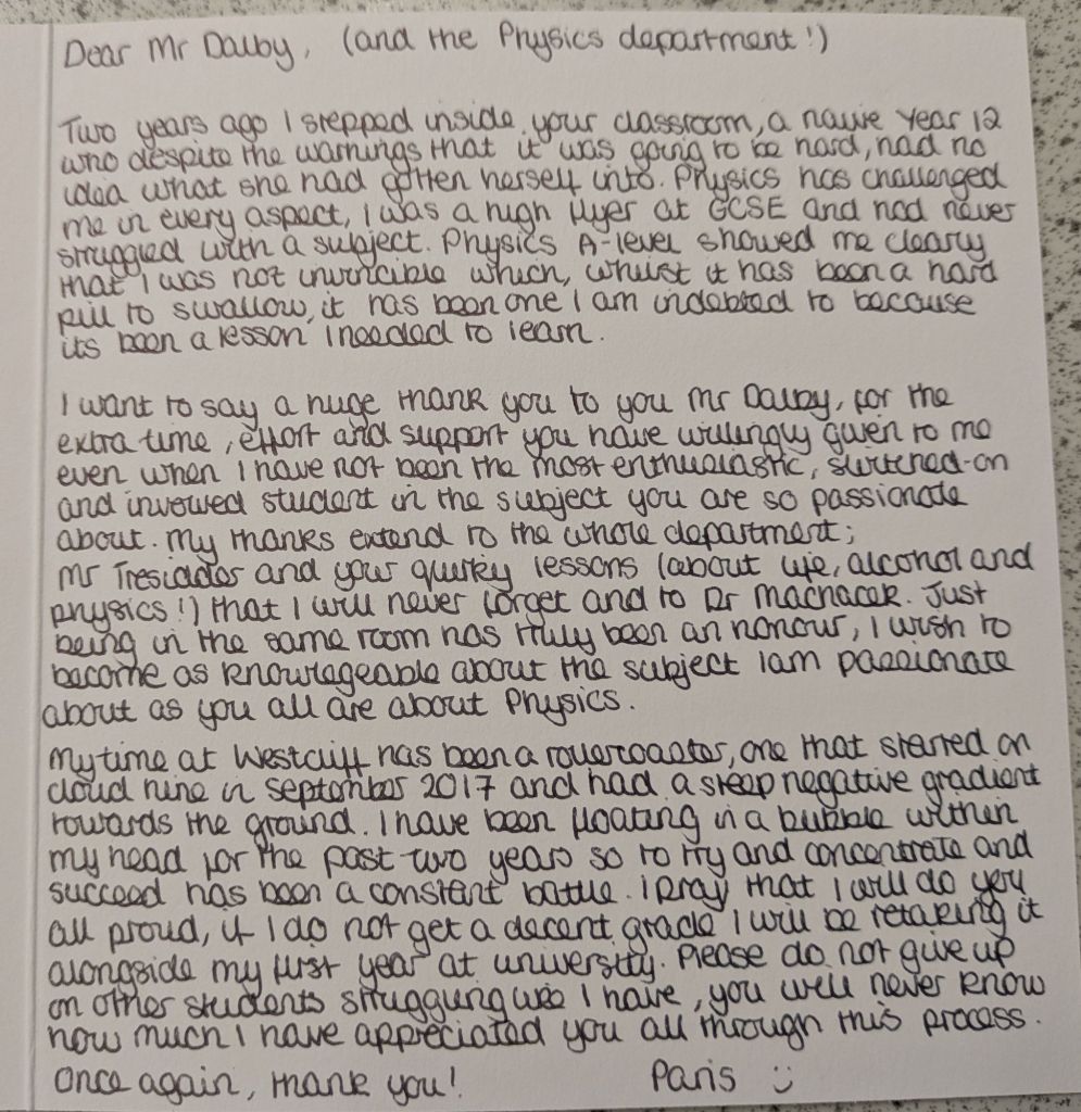 And then they leave, and a new batch arrives, and the cycle repeats again. Many students wish to give their teachers gifts to show their appreciation, especially in the Summer when they are leaving to go to college or university. We teachers do not expect gift, but the little tokens of appreciation mean a lot. As a teetotal vegan, I cannot count how many mugs I have been bought (ironically, I very rarely drink hot drinks, so they rarely get used). To me, what means more is the little notes of appreciation. The cards and letters. I keep these, and when I’m having a bad day it is good to get them out and flick through them to remind myself that what I am doing is making a difference.